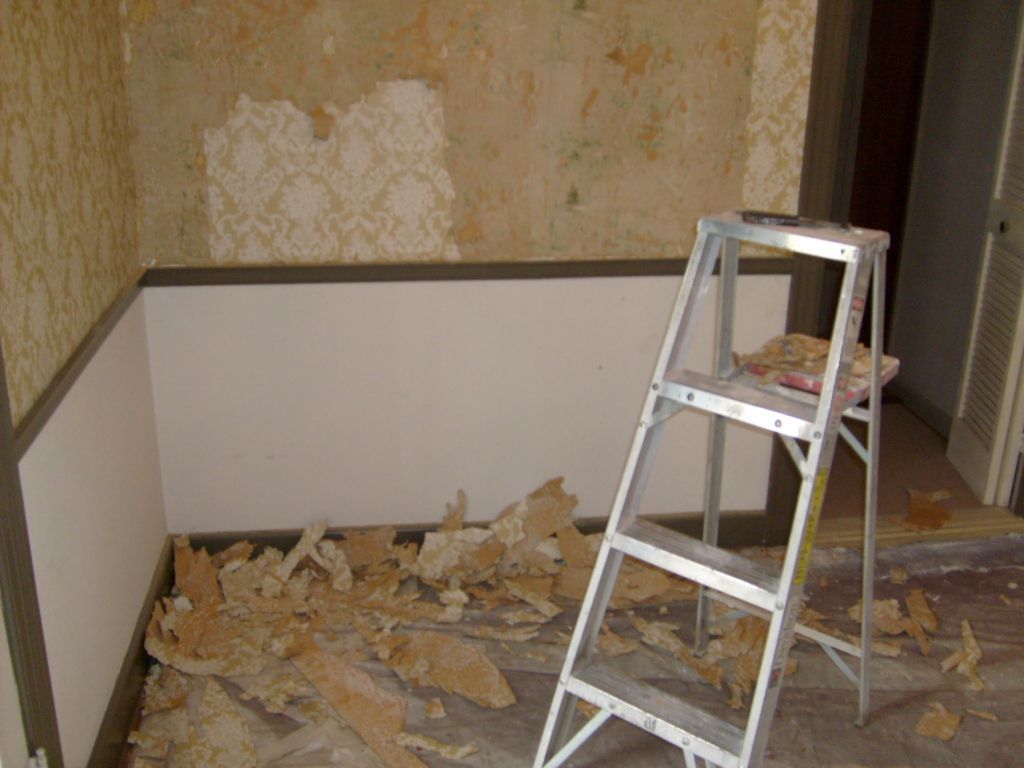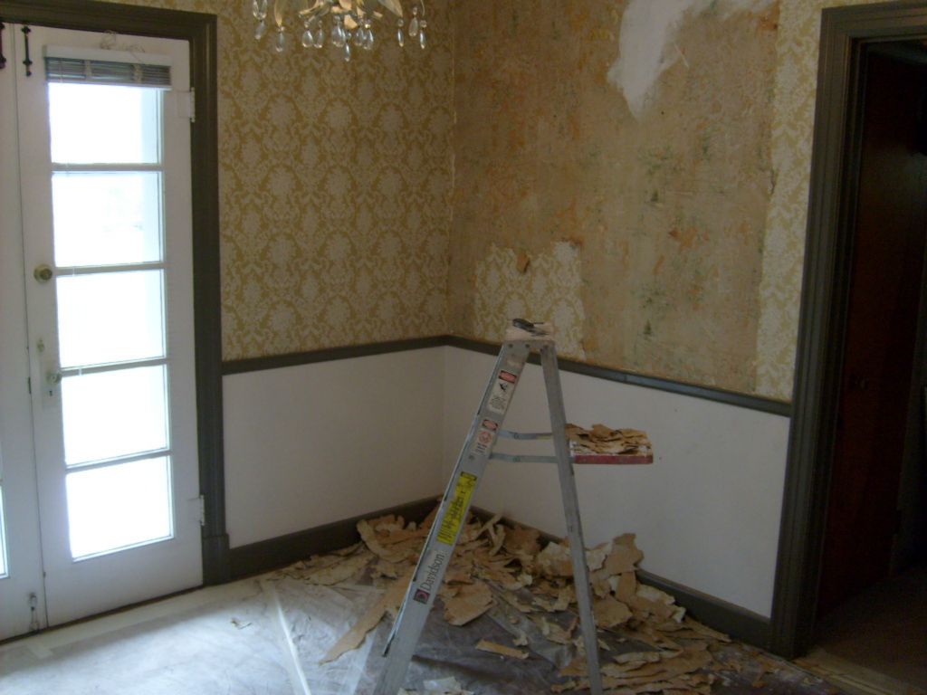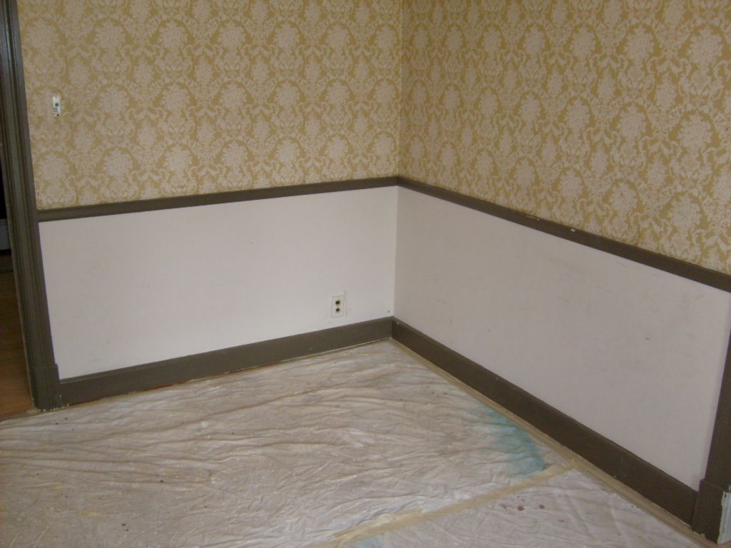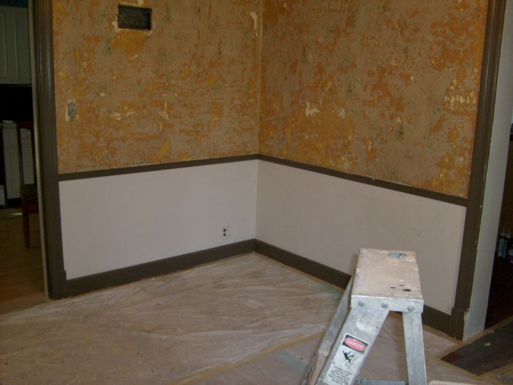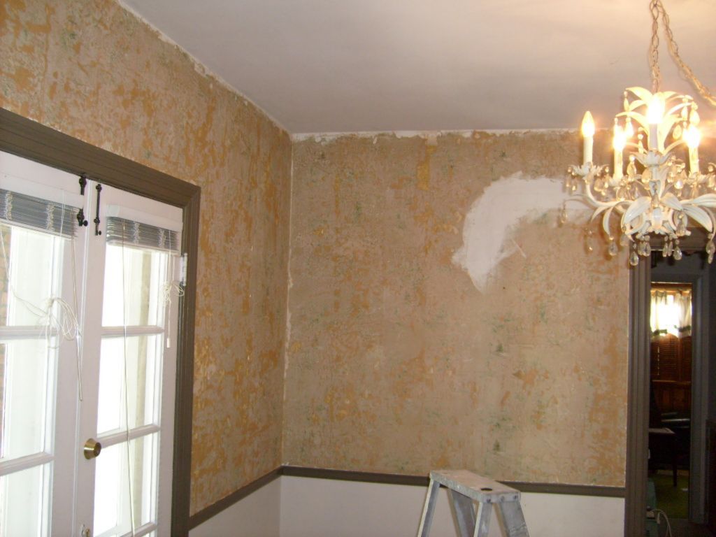 WHP removed wallpaper in this plaster walled 80 yrs or so old city house. Taped down drop cloths, removed paper. kilz primer becasue of extreme nicatine saturation. Rolled on join compound and random pattern stippled with round stipple brush.