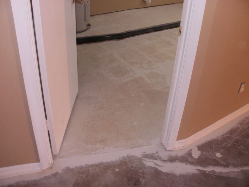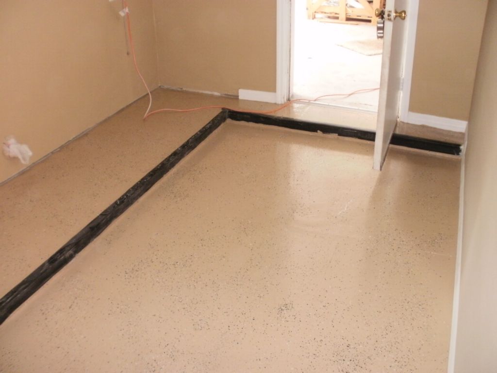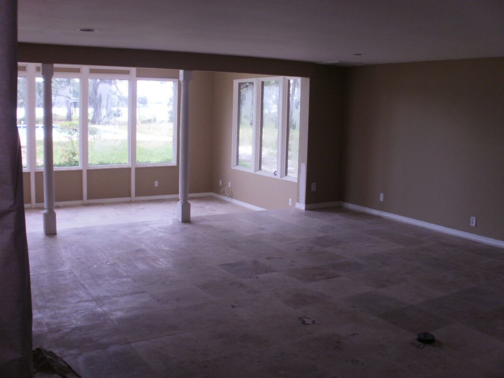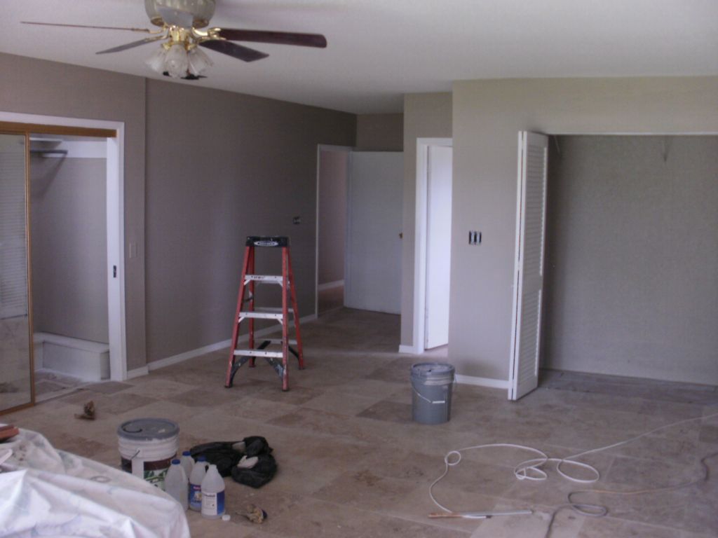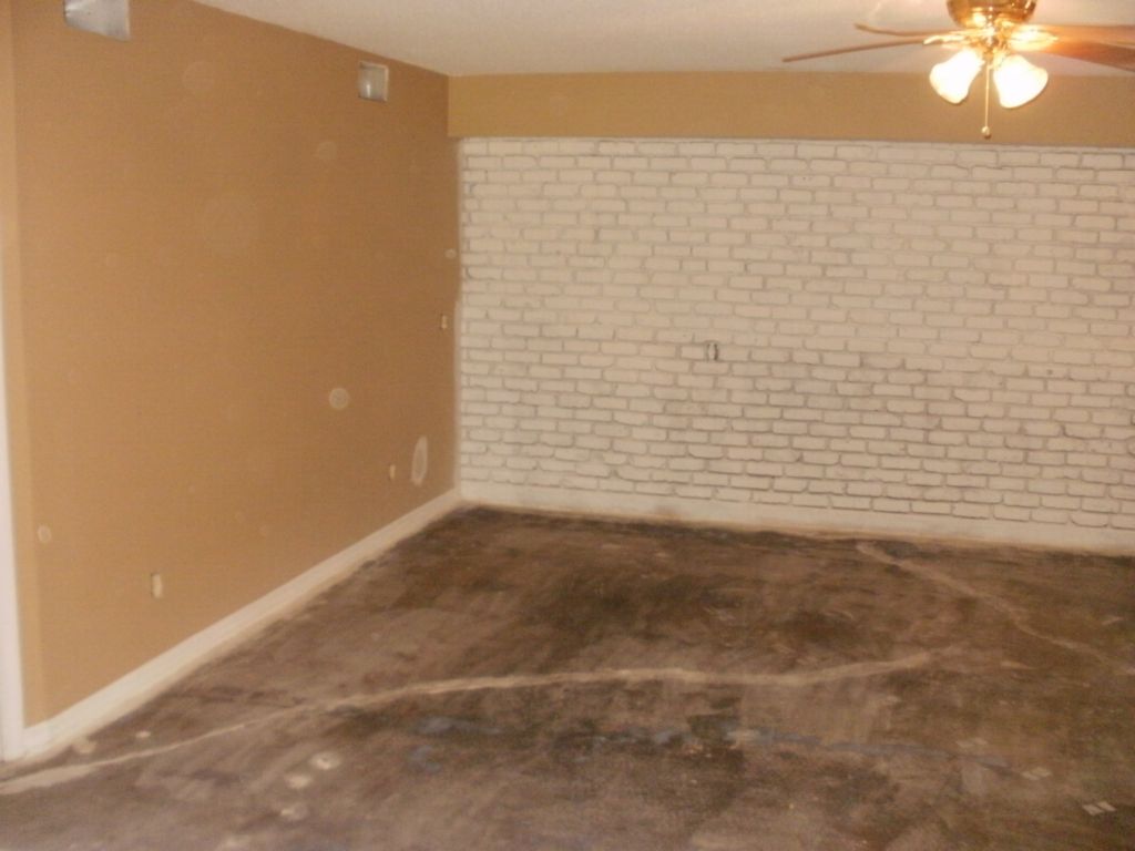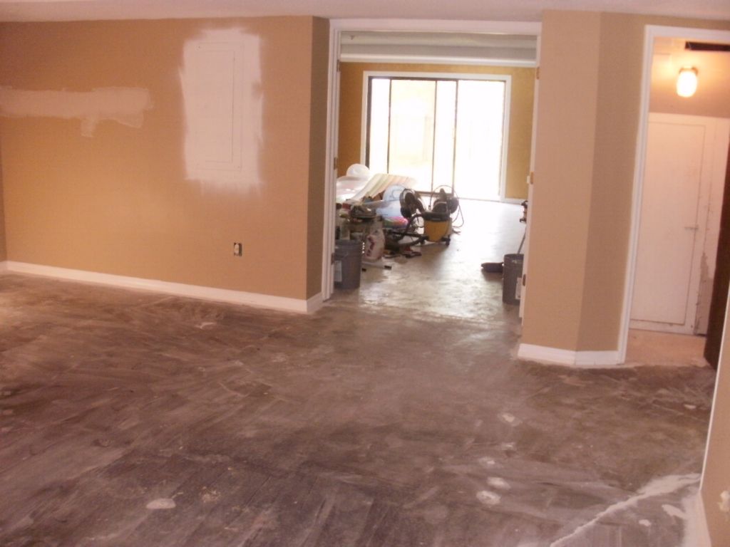 WHP preparing walls and floor for epoxy and brick painting in the den. Cleaned the floor and put filer leveler then coated with lockdown bonding agent for the epoxy. Primed the brick, caulked the trim and primed, filled holes in walls and sanded.