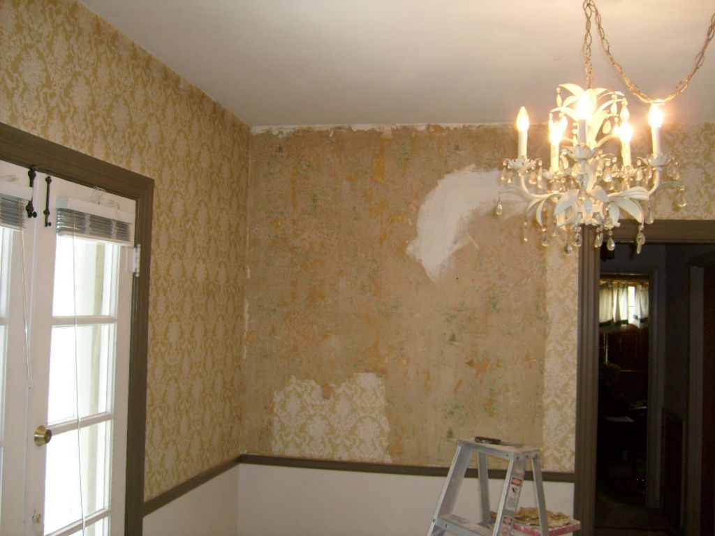 WHP removed wallpaper in this plaster walled 80 yrs or so old city house. Taped down drop cloths, removed paper. kilz primer becasue of extreme nicatine saturation. Rolled on join compound and random pattern stippled with round stipple brush.