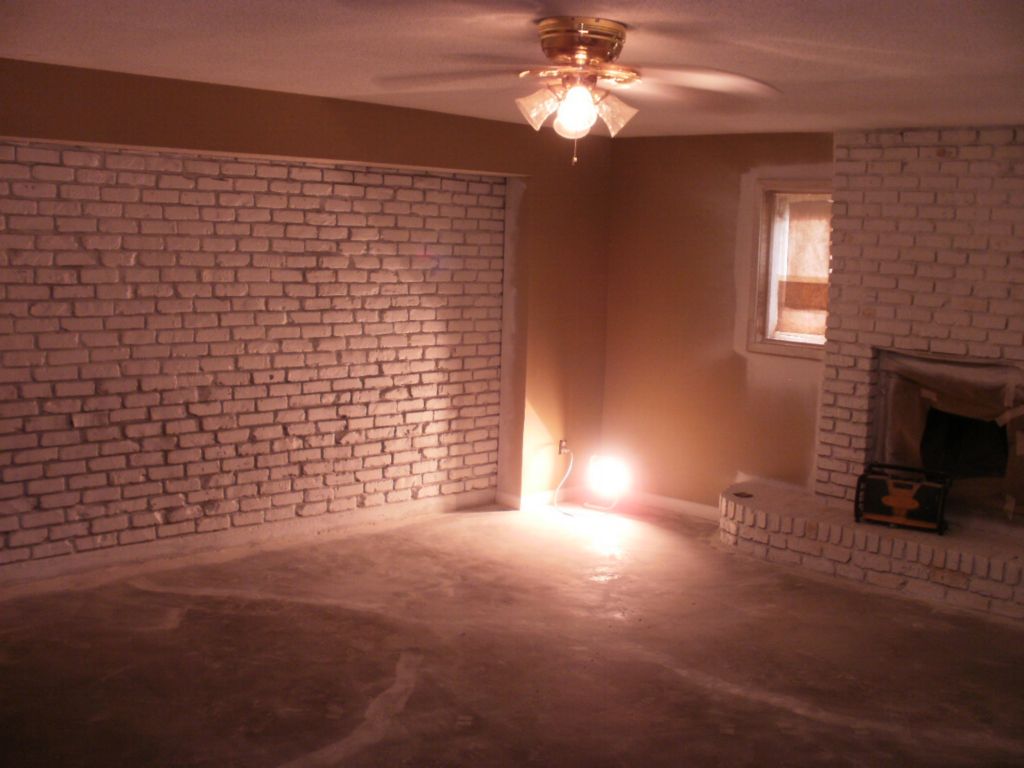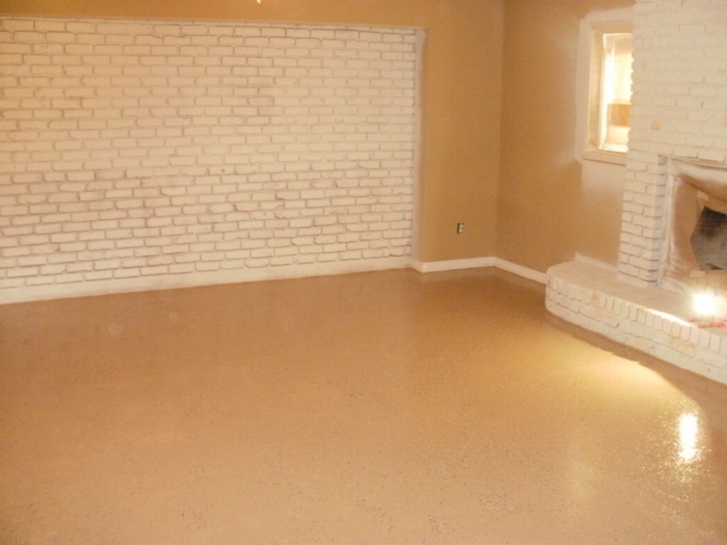 Epoxied floor, finish coated brick 2 coats. Cut and rolled walls 2 coats and painted the trim and baseboard 2 coats.