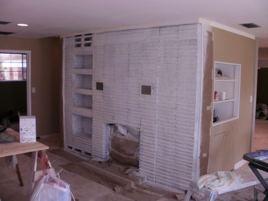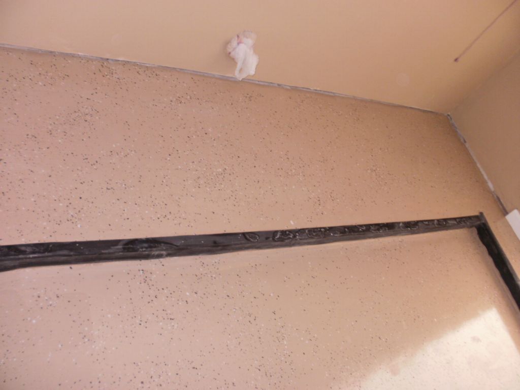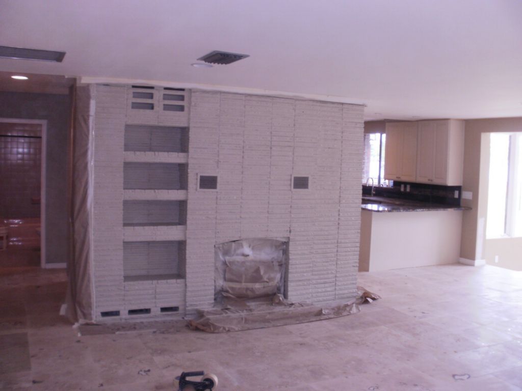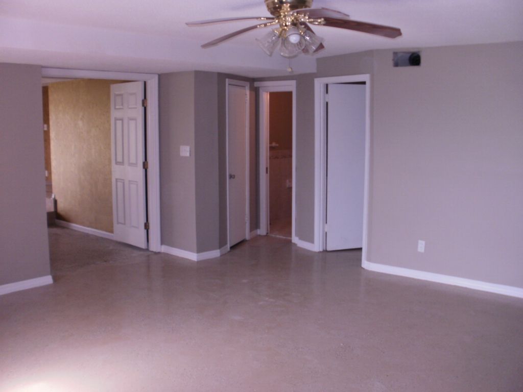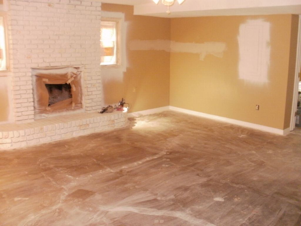 WHP preparing walls and floor for epoxy and brick painting in the den. Cleaned the floor and put filer leveler then coated with lockdown bonding agent for the epoxy. Primed the brick, caulked the trim and primed, filled holes in walls and sanded.